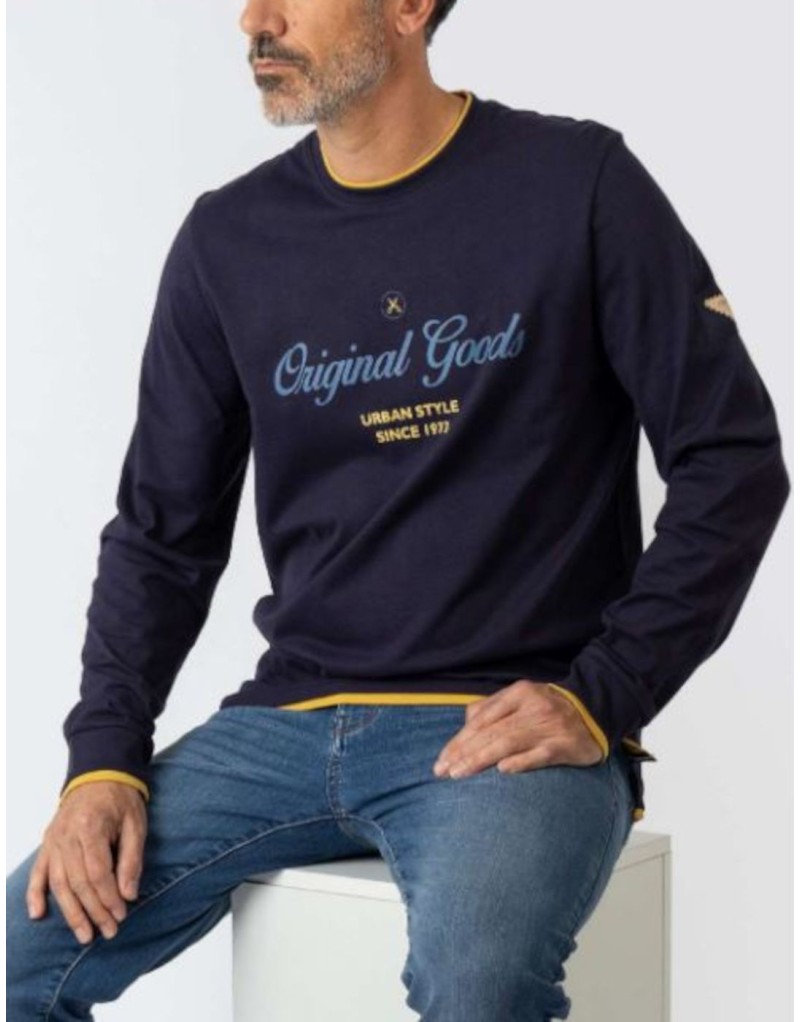 Camiseta manga larga con puños y aberturas en los bajos laterales, cuello redondo y frase en el frente.