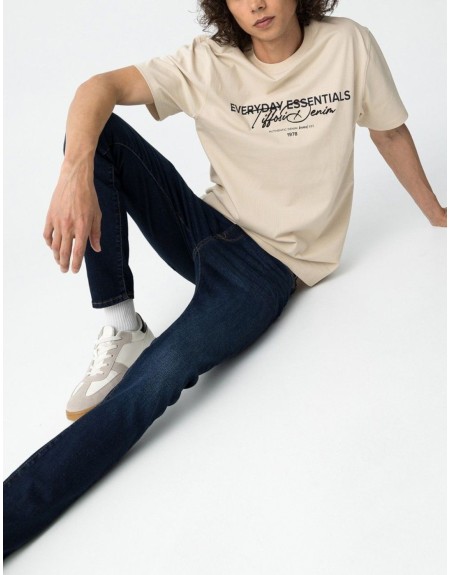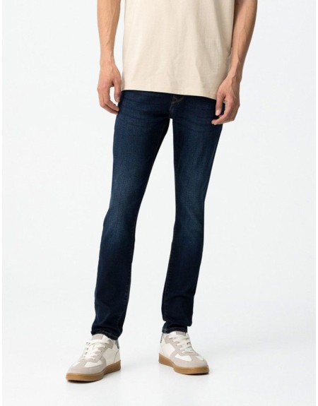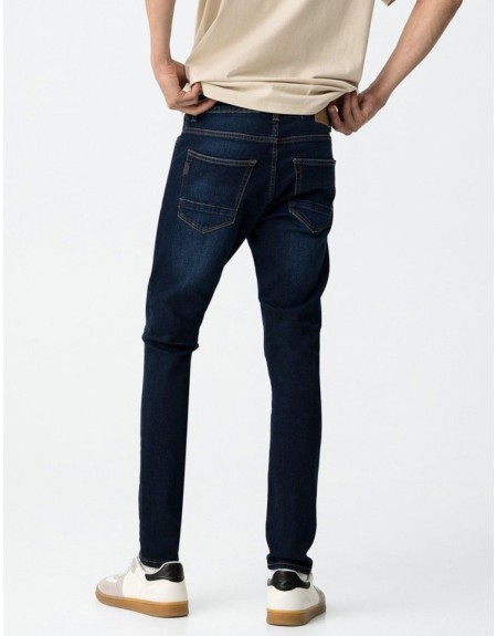 Pantalón vaquero de cinco bolsillos. Modelo pitillo de cintura media con cierre frontal de cremallera y botón metálico. Disponible en color tejano oscuro.