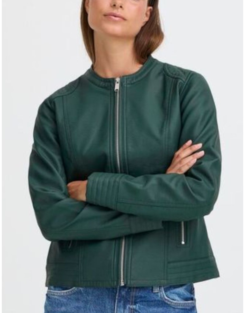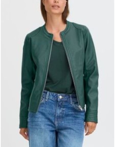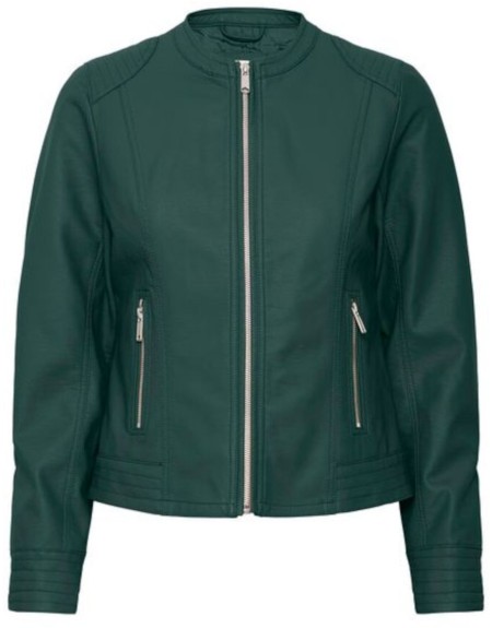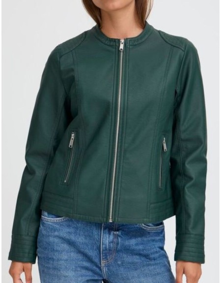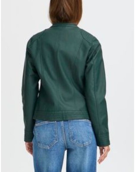 Chaqueta de polipiel con cierre cremallera. Modelo de manga montada y cuello redondo con bolsillos laterales con cierre de cremallera. De corte regular con forro interior y detalle de pespuntes decorativos en hombros, puños y bajo. Disponible en color verde botella.