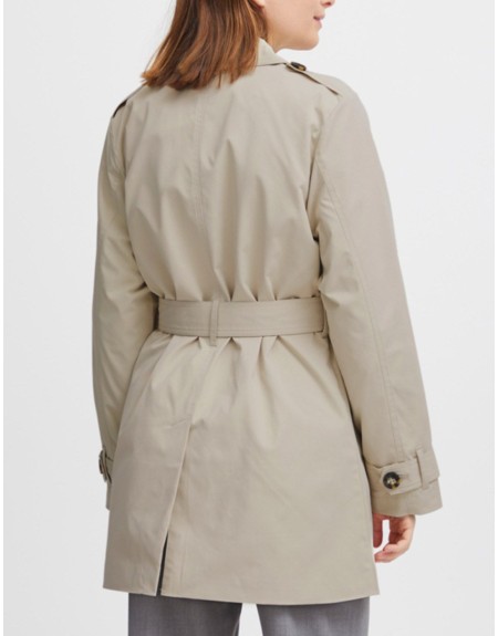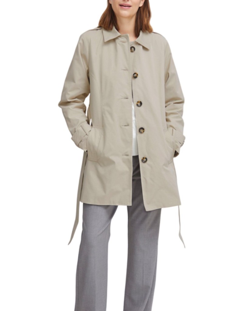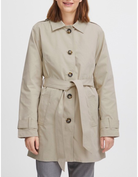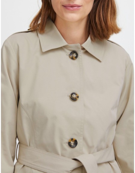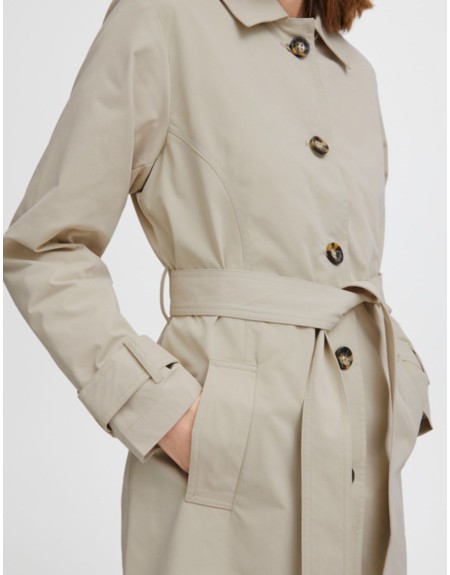 Trench de la marca Byoung en color beige (cemento) con cierre principal de botones, dos bolsillos laterales y cinturón de tela ajustable con botones en hombros y cuello de solapa