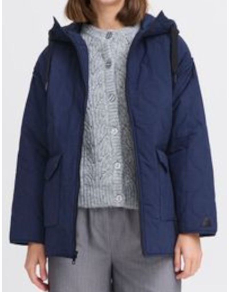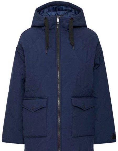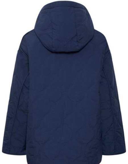 Chaqueta acolchonada, con capucha, modelo de corte recto, bolsillos por fuera con botones. Disponible en color marino.