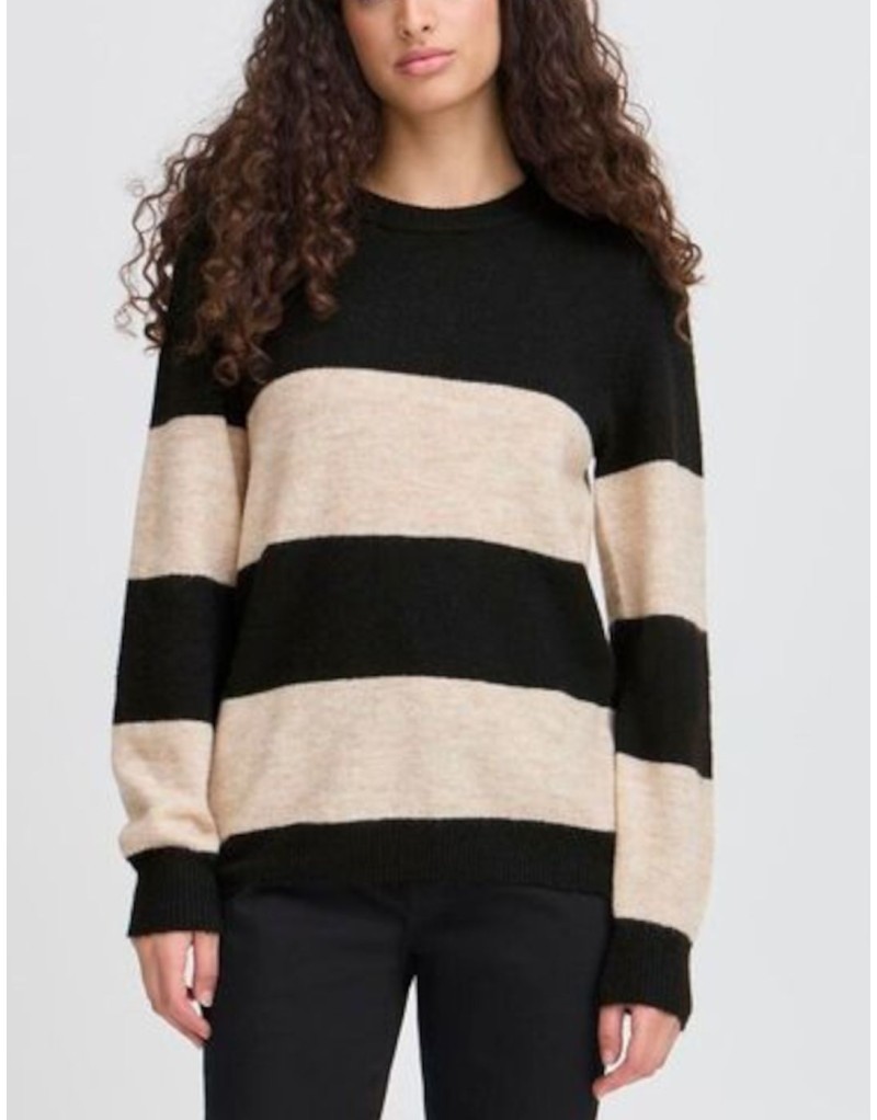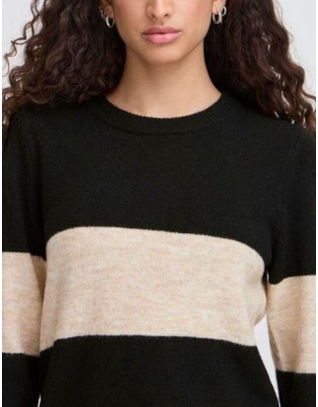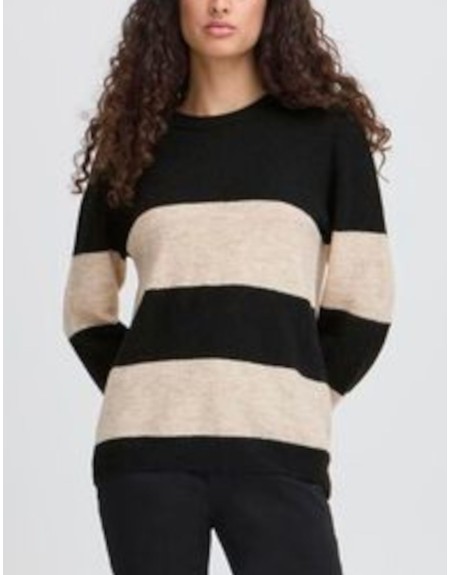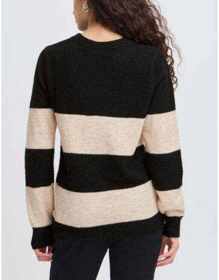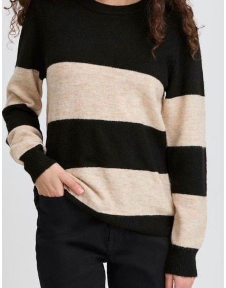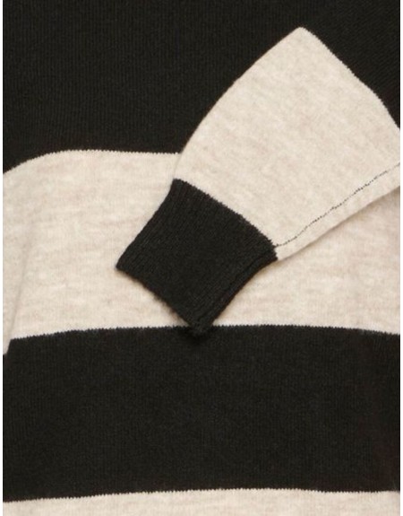 Jersey de manga larga montada. Modelo de corte holgado con cuello redondo. Su diseño se completa con el cuello, los puños y el bajo acanalados. Tejido suave y ligero. Estampado de rayas anchas horizontales en tonos negro y beige.